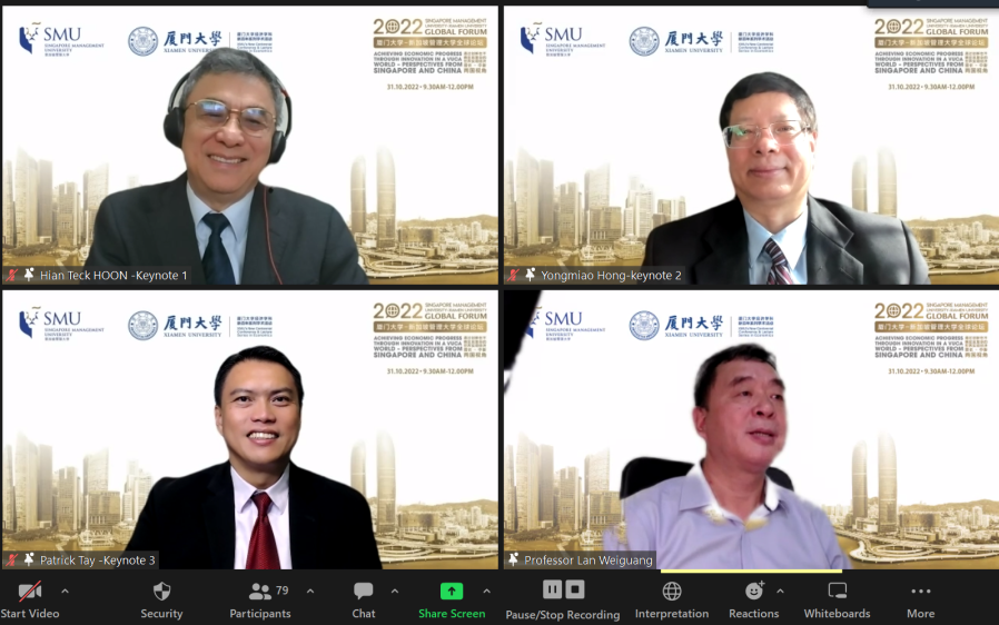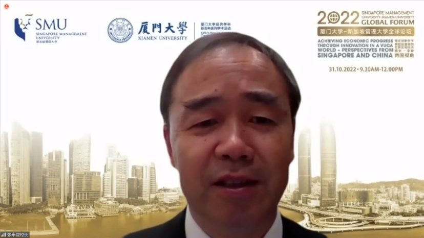 10月31日,“厦门大学-新加坡管理大学全球论坛”以网络会议的形式,在中国和新加坡两地连线举行。本次论坛的主题是“通过创新在不确定且复杂的世界实现经济增长——中新两国视角”。