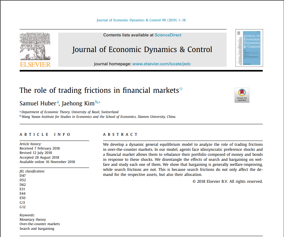 近日,WISE与经济学院经济系Jaehong Kim副教授和巴塞尔大学Samuel Huber合作的题为“The role of Trading Frictions in Financial Markets”的论文发表在Journal of Economic Dynamics & Control 2019年第99卷。