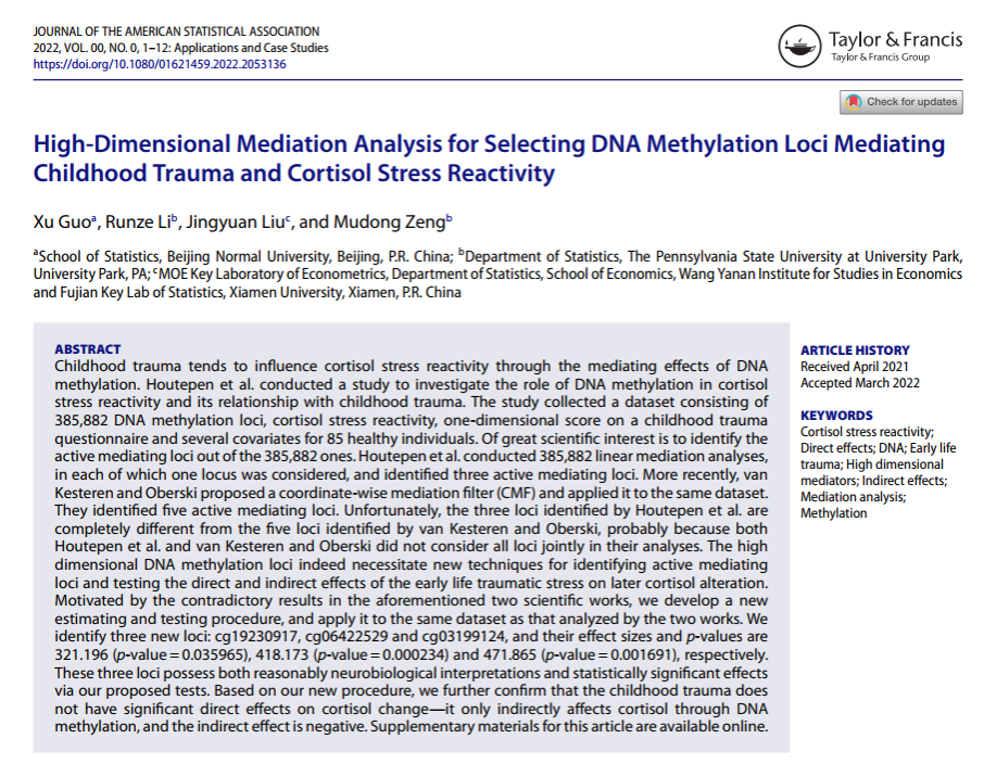 近日,经济学科青年教师刘婧媛教授,与北京师范大学郭旭副教授,宾夕法尼亚州立大学李润泽教授、曾沐冬博士合作的题为“High-Dimensional Mediation Analysis for Selecting DNA Methylation Loci Mediating Childhood Trauma and Cortisol Stress Reactivity”的论文在统计学国际顶尖期刊Journal of the American Statistical Association在线发表。