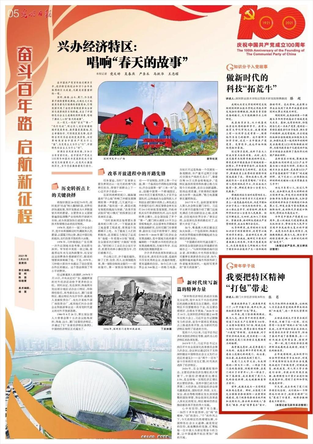 3月25日,光明日报第05版刊登了厦门大学经济学院本科生张荀受访文章:《我要把特区精神“打包”带走》。