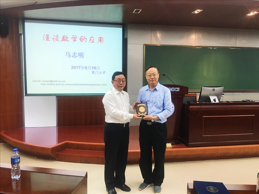 6月19日,中国科学院院士、第三世界科学院院士马志明莅临厦大经济学科,为师生带来一场题为“漫谈数学的应用”的南强学术讲座。讲座开始前,厦门大学科技处处长谭忠为马志明院士颁授南强学术讲座纪念牌。