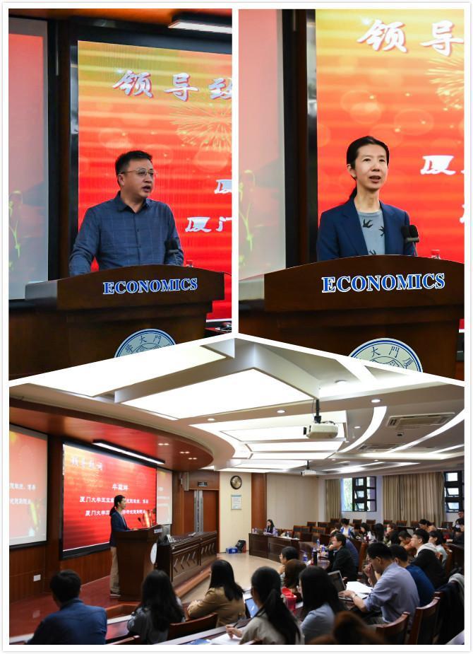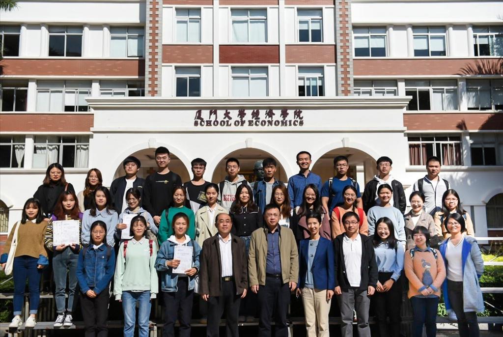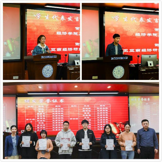 最后,经济学院2018级硕士生常森峰和WISE 2018级博士生谢玉湘分别作为优秀学术志愿者和优秀助教代表发表了获奖感言。两位同学在感谢学院对自己工作认可的同时,也表示将继续不忘初心、砥砺前行,付出更优质的服务与奉献。会后,与会师生在经济楼门前合影留念。
