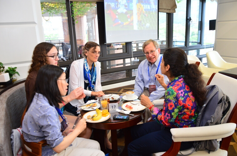 2014年6月,王亚南经济研究院、经济学院为致礼Jerry A. Hausman教授杰出贡献而联合举办“2014计量经济学理论与应用前沿发展国际研讨会”,图为Jerry A. Hausman教授与参会人员在咖啡屋交流。