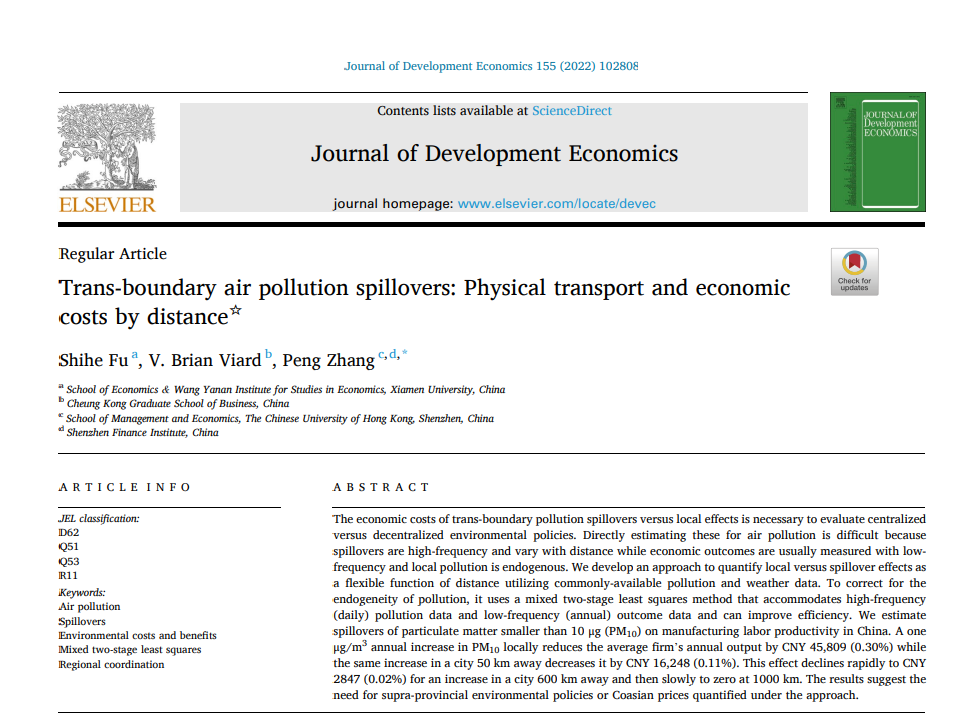 近日,经济学院经济研究所与邹至庄经济研究中心傅十和教授,与长江商学院V. Brian Viard教授、香港中文大学和深圳高等金融研究院张鹏助理教授合作的题为“Trans-Boundary Air Pollution Spillovers: Physical Transport and Economic Costs by Distance”的论文发表在发展经济学顶级期刊Journal of Development Economics 2022年第155卷。