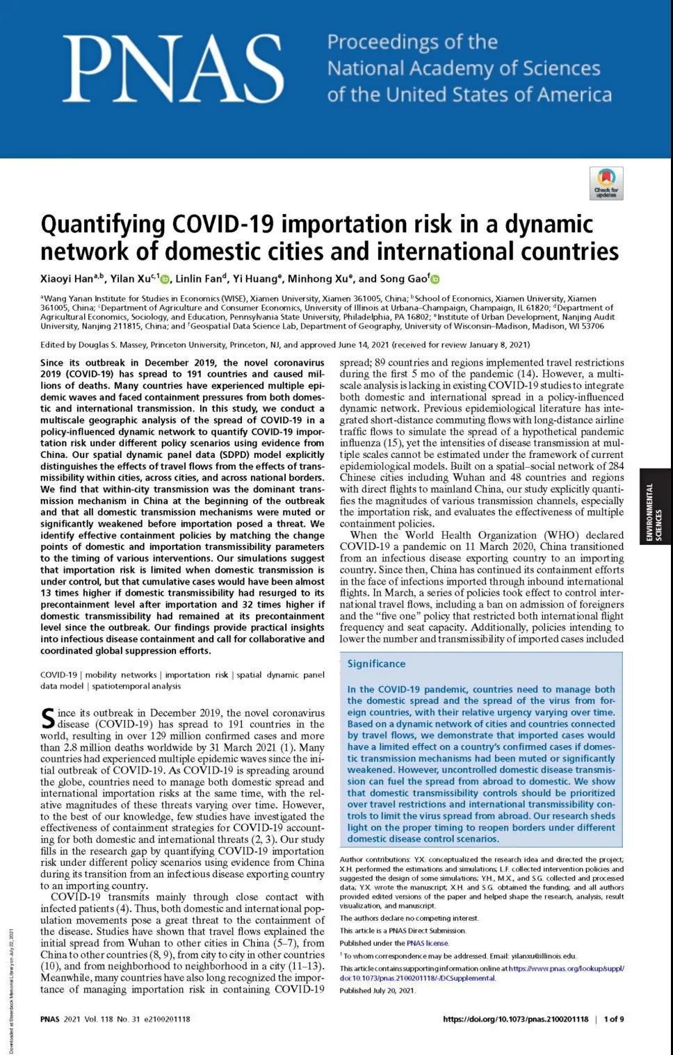 近日,厦大经济学科韩晓祎副教授与伊利诺伊大学香槟分校许亦岚副教授,宾夕法尼亚州立大学樊琳琳助理教授,南京审计大学黄怡、徐旻鸿助理教授,及威斯康星大学麦迪逊分校高松助理教授合作的题为“Quantifying COVID-19 Importation Risk in A Dynamic Network of Domestic Cities and International Countries”的论文在国际科学界权威期刊《美国科学院院刊》(Proceedings of the National Academy of Sciences of the United States of America,简称PNAS)上正式发表。《美国科学院院刊》(PNAS)是与《细胞》(Cell)、《自然》(Nature)、《科学》(Science)齐名的国际四大顶级科学名刊之一。此成果也是国家自然科学基金基础科学中心项目——“计量建模与经济政策研究”的阶段性研究成果之一。