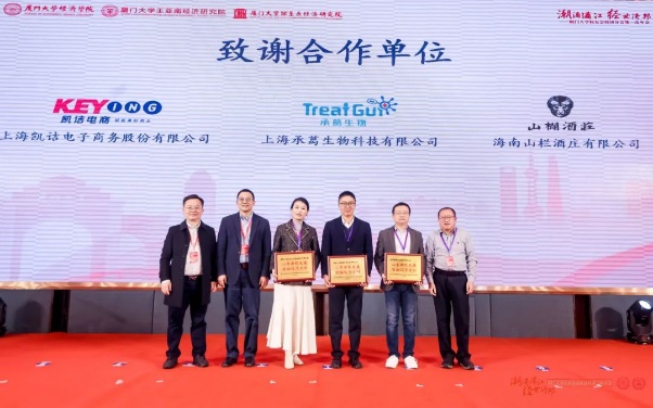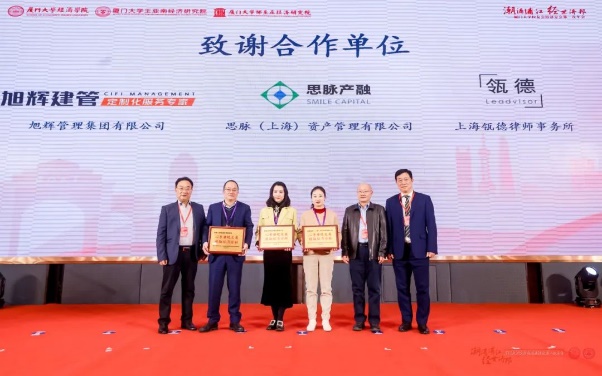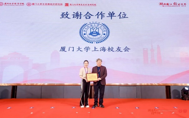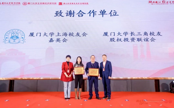 院友吴新春、熊贻德、郭雪青、陈剑峰、王江斌、杨翊杰、仇璐、余森清、李斌,先后为荣耀合作伙伴——旭辉管理集团有限公司、思脉(上海)资产管理有限公司、上海瓴德律师事务所,光耀合作伙伴——上海凯诘电子商务股份有限公司、上海承葛生物科技有限公司、海南山栏酒庄有限公司,协办单位——厦门大学上海校友会嘉英会、厦门大学上海校友会长三角校友股权投资联谊会和承办单位厦门大学上海校友会颁发感谢牌。