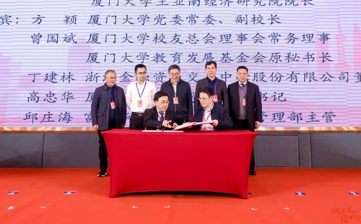 在实习基地签约仪式上,厦门大学王亚南经济研究院副院长王艺明代表厦大经济学科,与浙江金融资产交易中心股份有限公司董事长丁建林,中国农业银行股份有限公司苏州分行人力资源部副总经理李凯,福州市金融控股集团有限公司董事长叶发强,上海富友金融服务集团股份有限公司董事长陈建,容诚会计师事务所合伙人涂振连,中大雅润(天津)供应链管理有限公司董事长周厦等院友和代表签约。