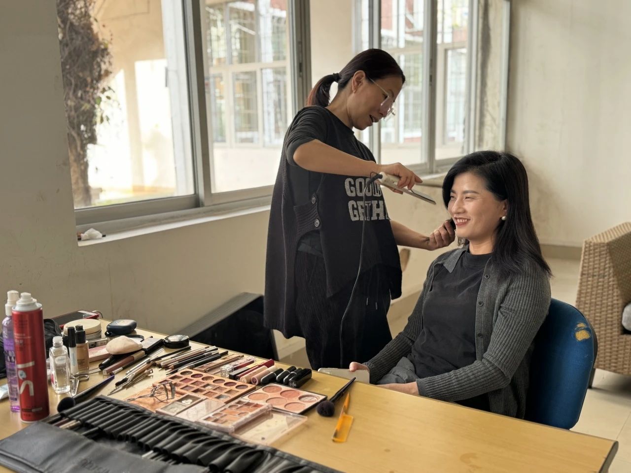 本次活动邀请专业团队,在C108教室做了精心布置,将其“华丽变身”为化妆间和摄影棚,化妆师根据老师们要求提供妆发设计,摄影师则记录下来大家每一个神采飞扬的瞬间。