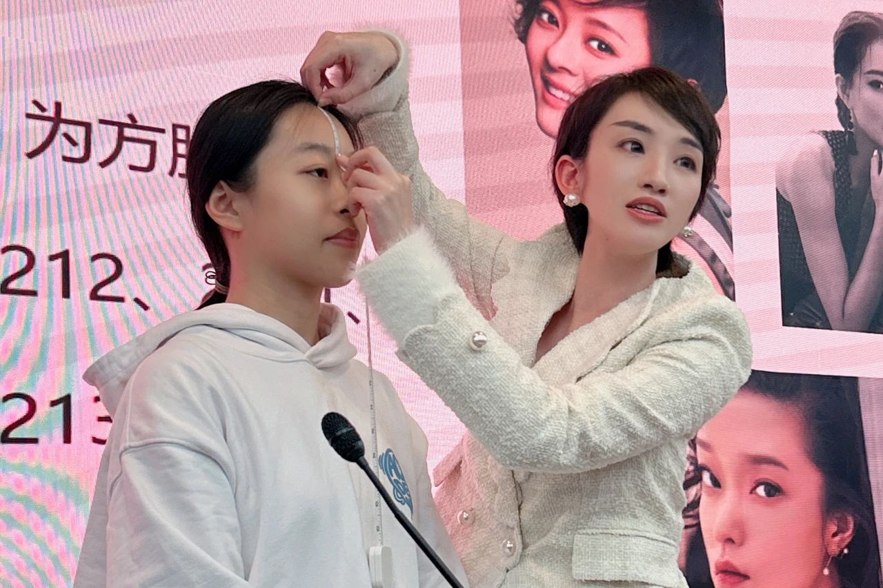 讲座中,老师手把手地教大家如何根据自己的肤质科学护肤,如何根据自己的肤色、脸型及五官比例画出最适合自己的生活妆容。与座师生通过系统讲解与互动,在发放的“变美小档案”上记录了具有个人特色的信息,明晰了护肤和化妆过程中适合自己的方案。