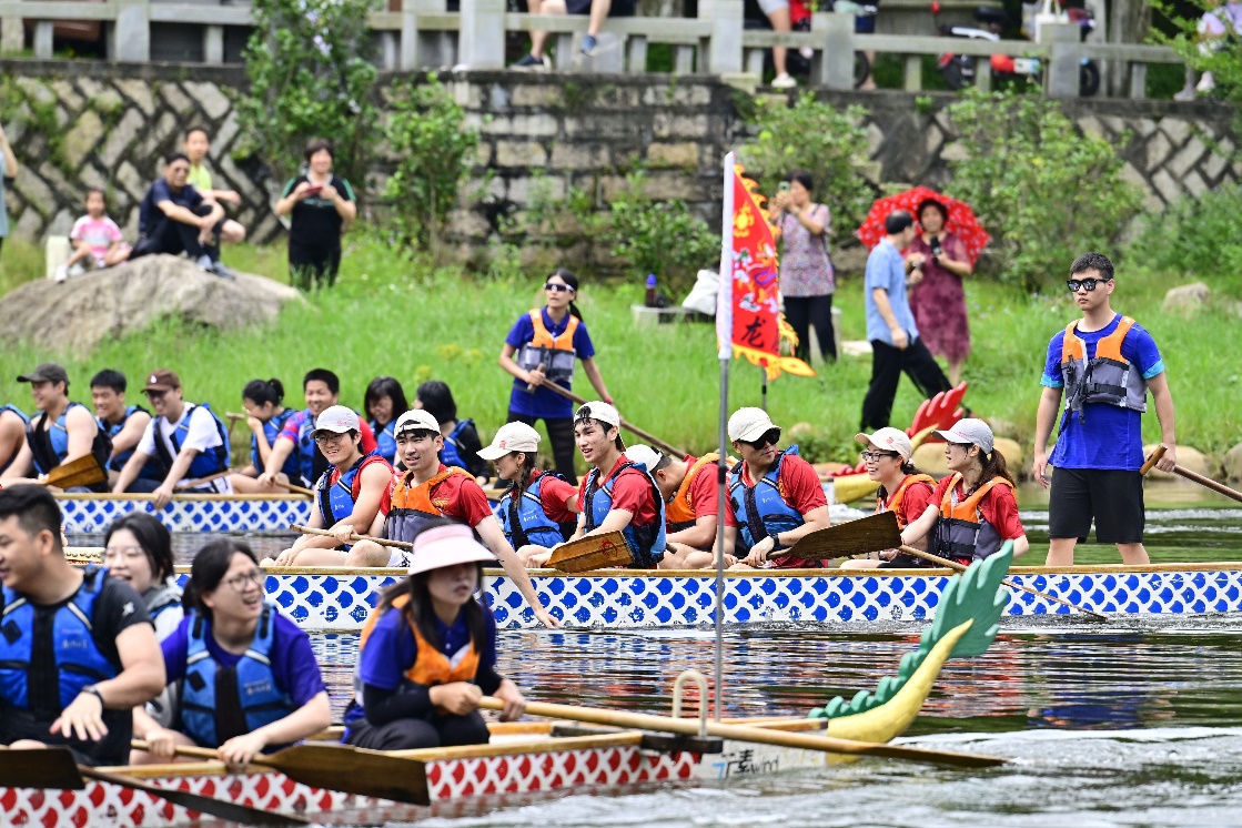 本次端午龙舟赛由厦门大学经济学科主办,白鸽在线(厦门)网络科技有限公司协办,厦门大学舟艇协会承办,来自经济学院、王亚南经济研究院、邹至庄经济研究院的10支队伍在思源谷的赛道上奋勇争先、劈波斩浪。