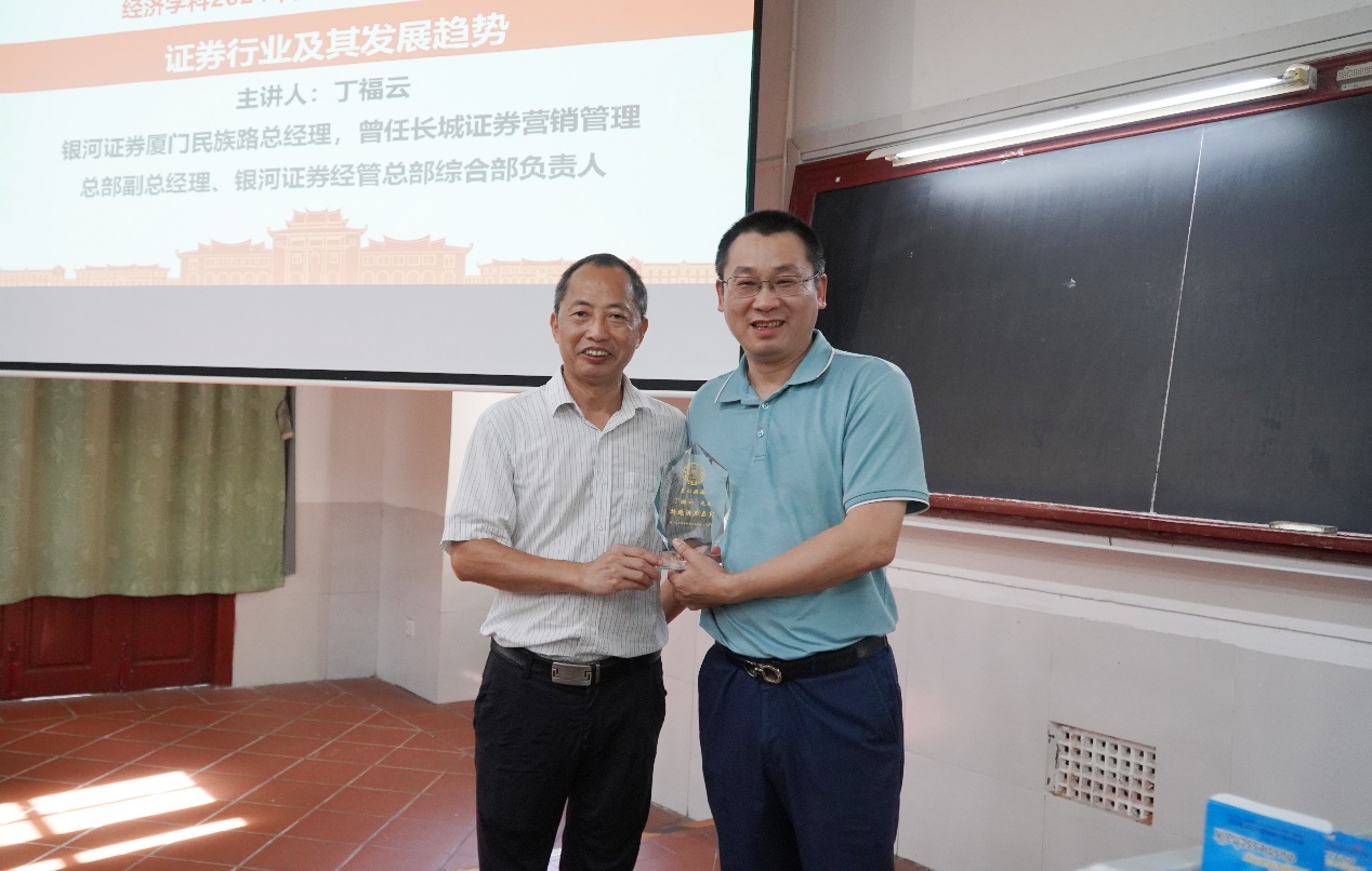 7月2日下午,厦大经济学科2024年夏季学期杰出校友系列讲座第三讲在群贤二102教室顺利举行,厦门银河证券丁福云应邀作了题为“证券行业及其发展趋势”的精彩讲座。经济学院原党委书记、厦门大学专职巡视员黄鸿德出席讲座并为主讲人颁授讲座纪念牌。