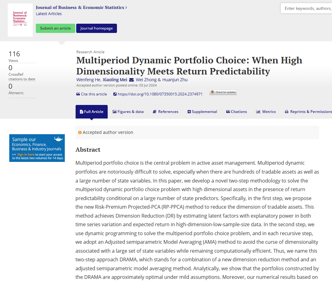 近日,厦门大学经济学院金融系和王亚南经济研究院梅小玲副教授、王亚南经济研究院和经济学院统计学与数据科学系钟威教授、朱浣君副教授与厦门大学经济学院金融系2019级硕士毕业生何汶峰合作完成的学术论文“Multiperiod Dynamic Portfolio Choice: When High dimensionality Meets Return Predictability”在线发表于统计学与计量经济学国际权威期刊Journal of Business & Economic Statistics。