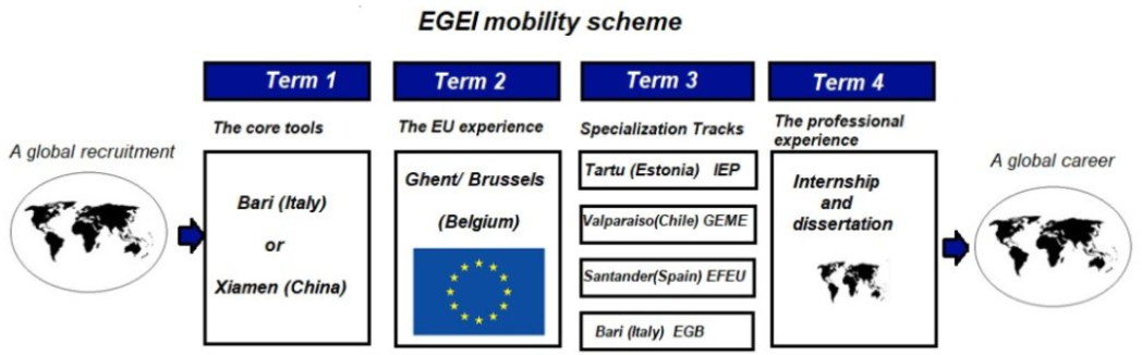 因其高质量的特色培养模式,2020年EGEI项目第三次获得欧盟“伊拉斯莫斯”荣誉项目的资助和认证,项目目前由中国厦门大学、意大利巴里大学、比利时根特大学、比利时欧洲政策研究中心、西班牙坎塔布里亚大学、法国里尔大学、爱沙尼亚塔尔图大学和智利费德里科圣玛丽亚科技大学等在内的全球八大高校及科研机构组成,面向全世界招收优秀青年学生进行经济学硕士培养。