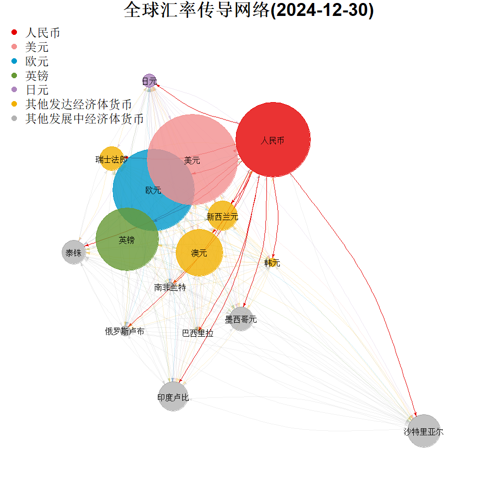 12月30日,厦门大学经济学科与新华指数联合编制的《全球汇率传导指数报告(2024)》发布。报告指出,国际货币体系正经历百年未有之大变局,美元的肆意武器化加速了去美元化趋势。在SDR篮子货币中,人民币汇率传导指数稳居第三位,比2023年底同比增长3.6%。美元的影响力虽仍排名第一,但同比下跌0.3%,人民币影响力的上升势头明显高于美元,在全球汇率传导网络中逐渐进入核心位置。