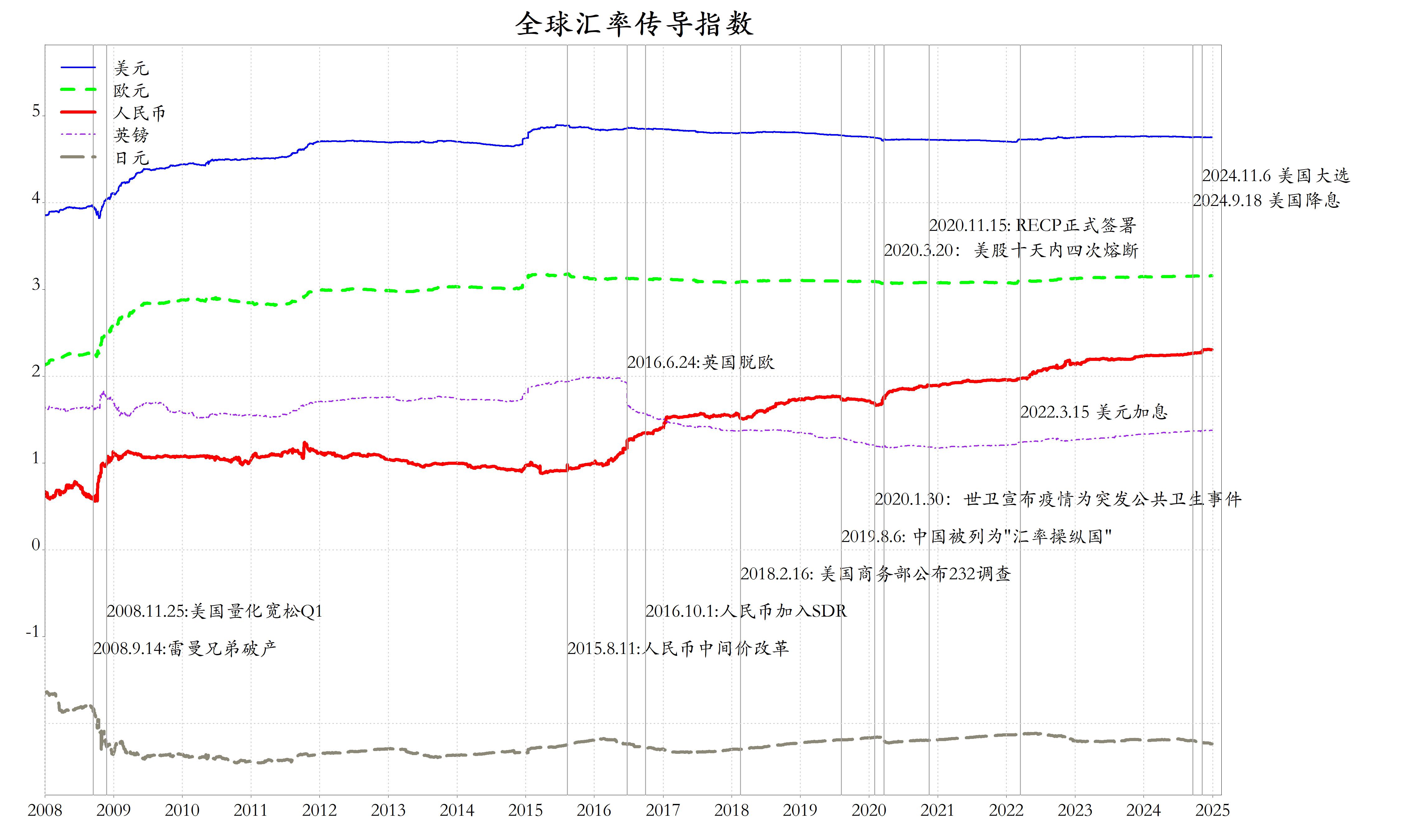 进一步深入分析汇率传导网络和人民币汇率传导指数,美元在全球主要货币体系中保持着较大影响力,一直处于全球汇率传导网络中心位置,如图2。