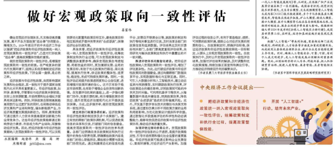 1月7日,厦门大学经济学院金融系主任姜富伟教授在《经济日报》“第10版:理论”发表《做好宏观政策取向一致性评估》一文。以下为该文全文: