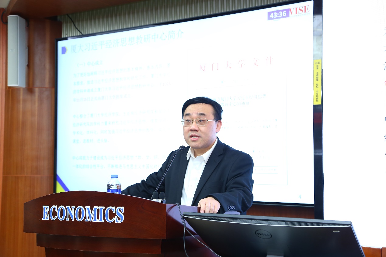 为了更好地阐释习近平经济思想的基本精神、基本内容、基本要求,厦门大学经济学科成立厦门大学习近平经济思想教研中心。周颖刚首先介绍了习近平经济思想教研中心的代表性研究成果、开展的相关课程和论坛与举办的学术会议等。随后,周颖刚重点阐述习近平在闽工作期间直接领导闽宁对口帮扶的宝贵经验,其形成了四项指导原则和五项合作机制,生动体现了“有为政府”与“有效市场”的有机结合。他从学理角度进行分析指出,我国减贫实践的经济理论基础不是依赖于西方的“理性经济人”假设,而是“有爱社会人“假设。基于此,周颖刚进一步阐释了党的二十届三中全会与习近平经济思想的理论创新,表明应坚持系统观念认识政府、市场和社会三者关系,并深入剖析“有为政府”“有效市场”和“有爱社会”的内涵与内在关联。“有为政府”“有效市场”和“有爱社会”三者的有机统一还体现在完善城乡融合发展体制机制,通过全面提高城乡规划、建设、治理融合水平,促进城乡要素平等交换、双向流动,推动城乡共同繁荣发展。