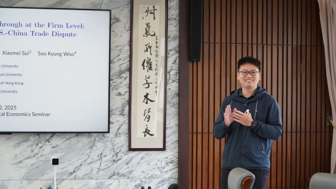 贺骋远助理教授分享的主题是“Incomplete Tariff Pass - Through at the Firm - level: Evidence from U.S.-China Trade Dispute”。他从中美贸易战中美国施加的进口关税由谁承担这一问题出发,集中讨论了美国进口关税负担的分配问题。他通过更为详细的数据集和构建量化一般均衡模型分析展示了在加征关税前后不同企业层面的价格变化、市场份额变动以及新贸易关系的建立。