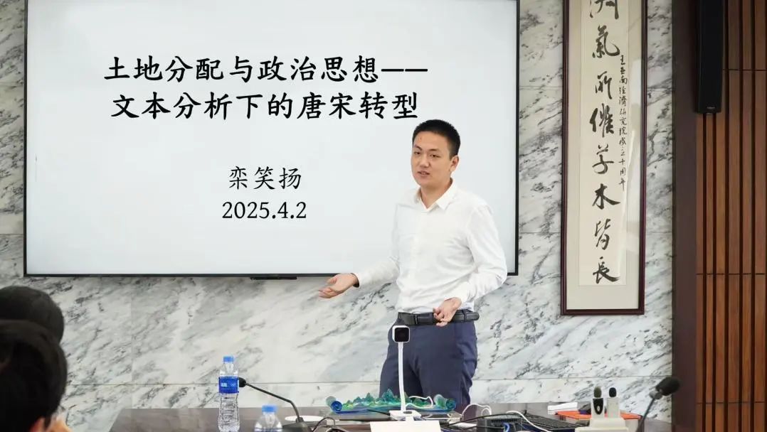 栾笑扬助理教授分享的主题是“土地分配与政治思想 —— 文本分析下的‘唐宋转型’”。他从人力资源角度深入探讨了创新阈值与社会转型,他认为除了科技创新外,思想创新和制度创新也十分重要。他详细解读了唐宋经济、政治、思想文化上的重大变革,分析了宋代土地分配、税收压力以及科举制度对社会结构的影响,并围绕分配建立一个“经济-政治-思想”的统一模型,他认为分配影响达到“创新阈值”的人口数量时就会影响思想、制度创新的方向,反之,思想、制度创新也会影响分配。