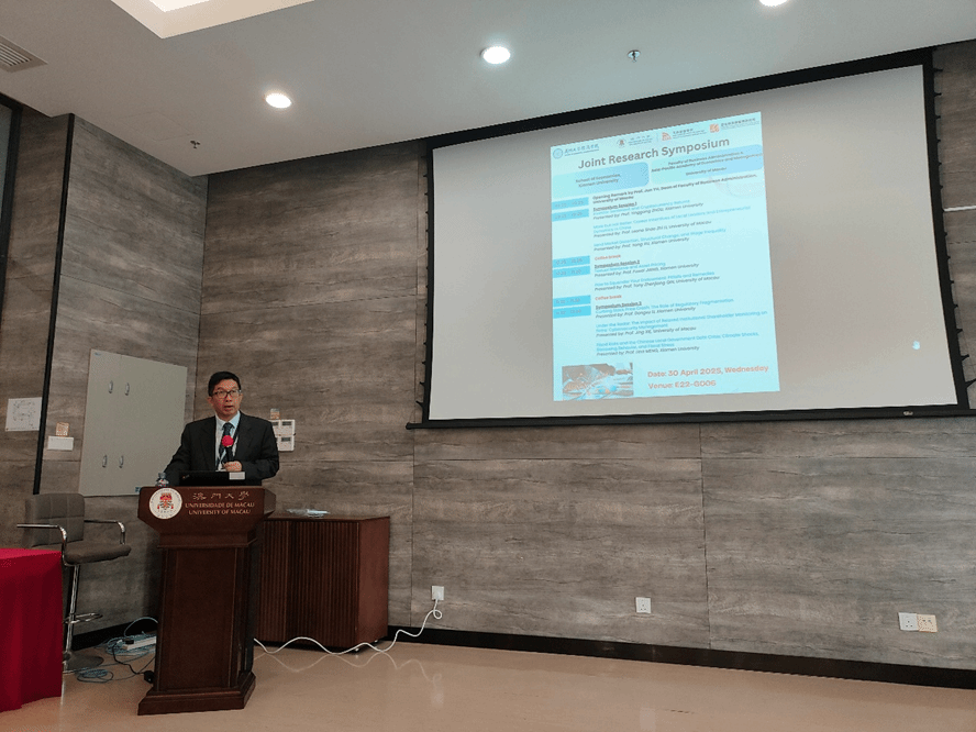 澳门大学工商管理学院院长余俊教授首先致辞,他向厦门大学经济学科到访的学者代表表示热烈的欢迎。余院长表示,两院互访交流不仅有助于金融经济领域的学术探讨深化,也为双方未来合作博士联合培养等项目奠定坚实基础。