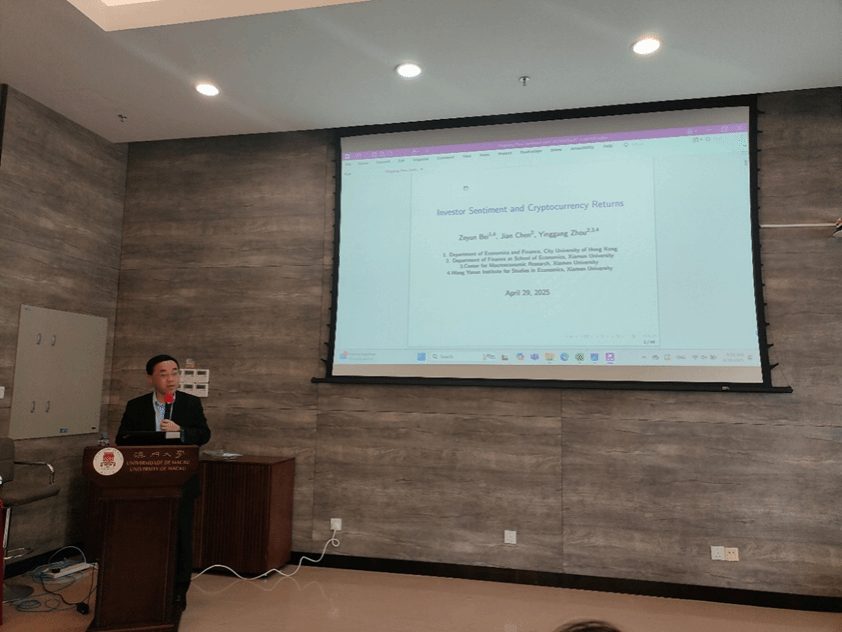 在上午的学术研讨会环节,澳门大学工商管理学院金融系主任康文津教授主持第一阶段的学术报告。周颖刚教授报告了题为“Investor Sentiment and Cryptocurrency Returns”的研究。该研究发现,与传统金融市场中投资者情绪负向预测股票收益率不同,加密货币市场中的投资者情绪能够在短期内正向预测加密货币的投资收益,但在长期内则驱动负向反转,并探讨了背后的机制。