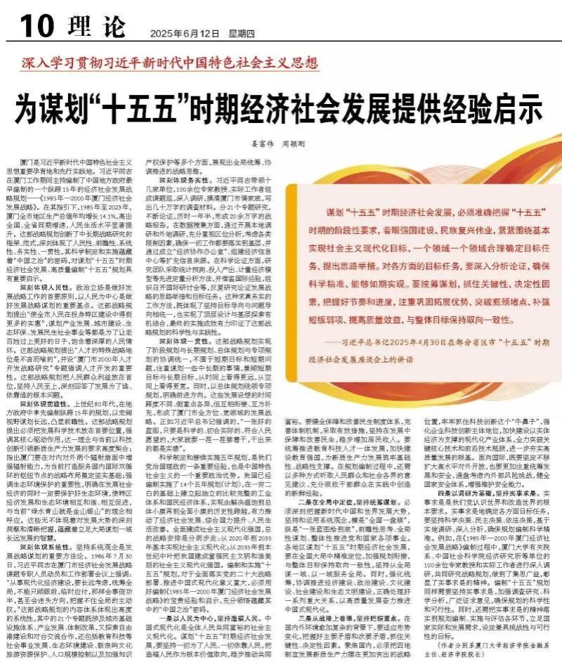 6月12日,厦门大学经济学院金融系主任姜富伟教授和经济学院、王亚南经济研究院院长周颖刚教授在《经济日报》第10版(理论)上发表题为《为谋划“十五五”时期经济社会发展提供经验启示》的合作文章。以下为该文全文。