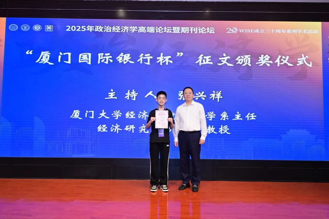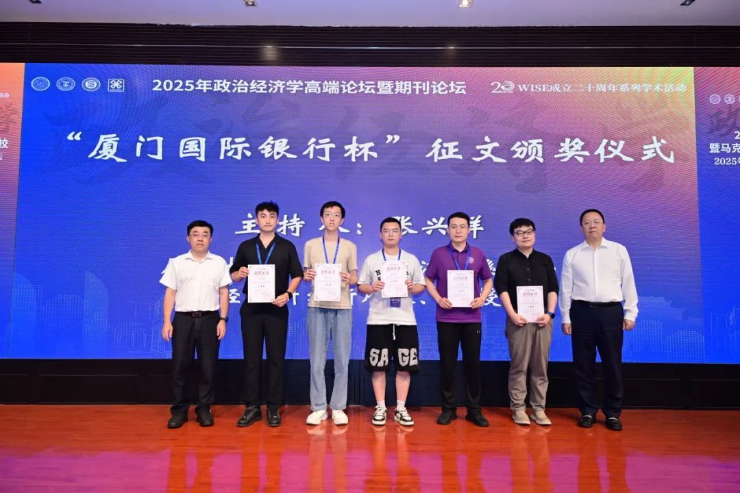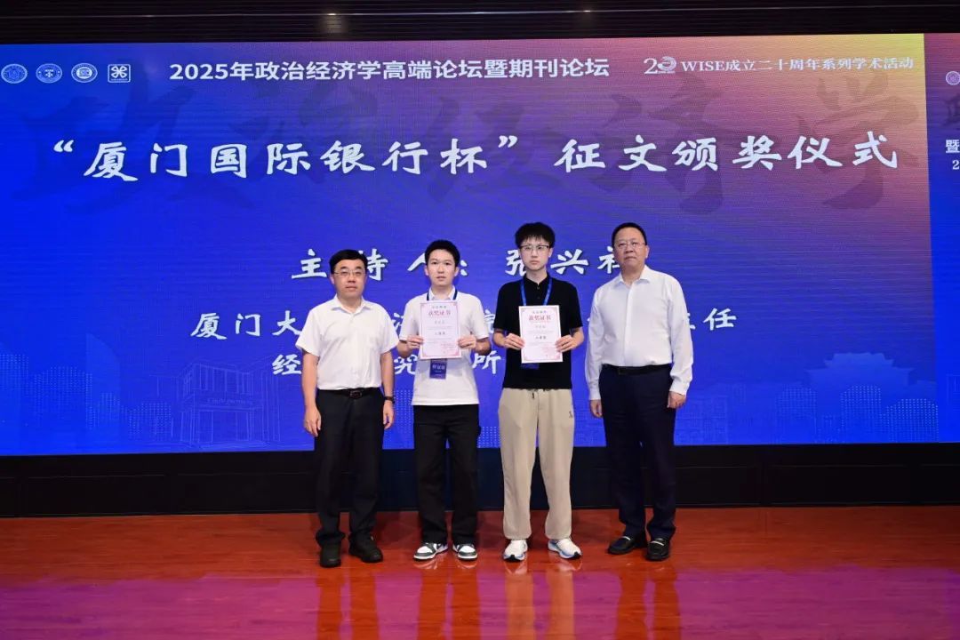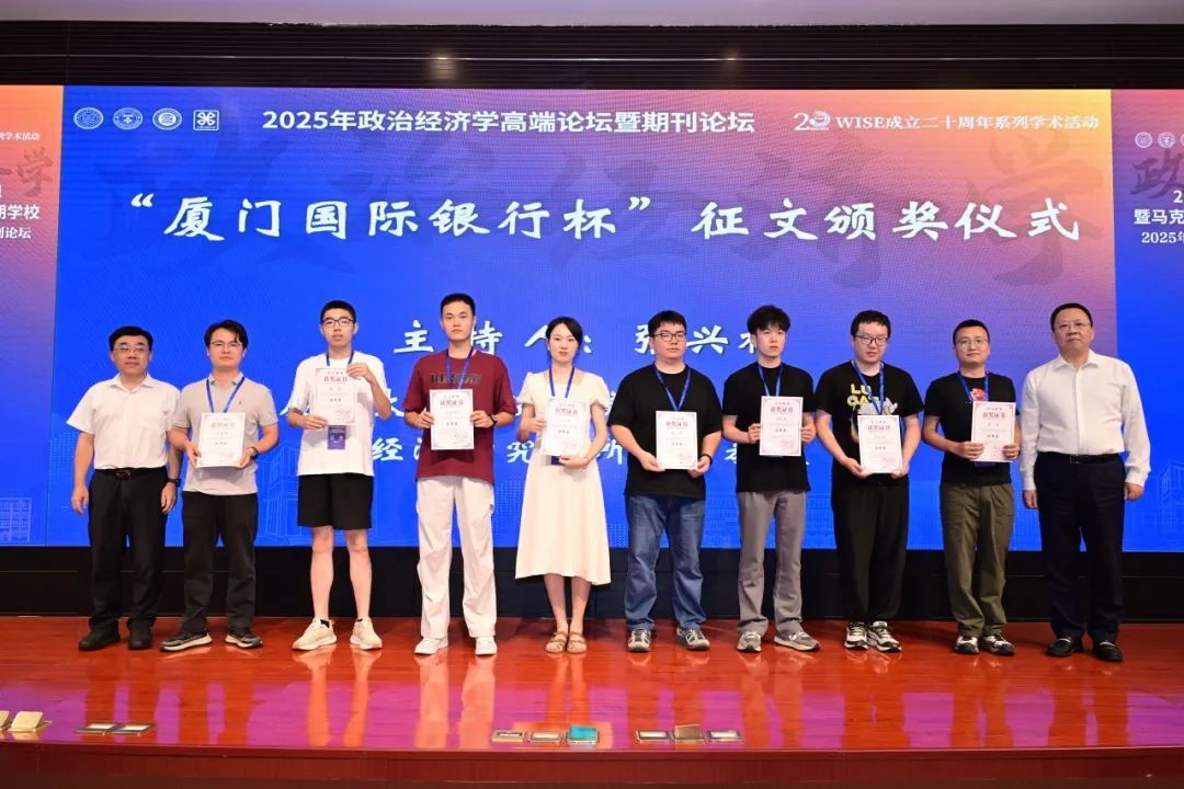 为激发广大青年学者和青年学生学习和研究政治经济学的热情,本届暑期学校发起“厦门国际银行杯”征文,征稿对象为国内外青年学者。本次共接收近50篇投稿,经过3轮专家评审匿名打分,共评选出一等奖1篇,二等奖2篇,三等奖5篇,以及优秀奖8篇。厦门国际银行董事会秘书祝建武、周颖刚院长共同为获奖作者颁奖。