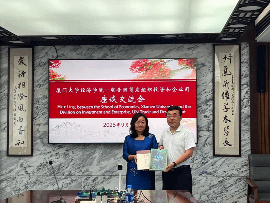 最后,双方互赠《2025世界投资报告——数字经济中的国际投资》和《厦门大学经济学科百年史》并合影留念。