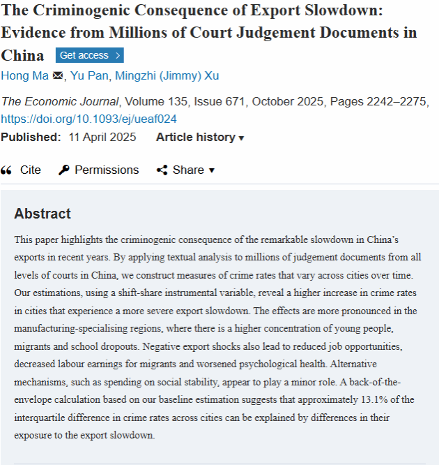 近日,厦门大学经济学院国际经济与贸易系、邹至庄经济研究院双聘助理教授潘煜和清华大学经济管理学院马弘教授、北京大学新结构经济学研究院徐铭梽副教授合作完成的学术论文“The Criminogenic Consequence of Export Slowdown: Evidence from Millions of Court Judgement Documents in China”在国际顶尖期刊The Economic Journal正式发表。该刊是厦大经济学科认定的国际A类期刊。