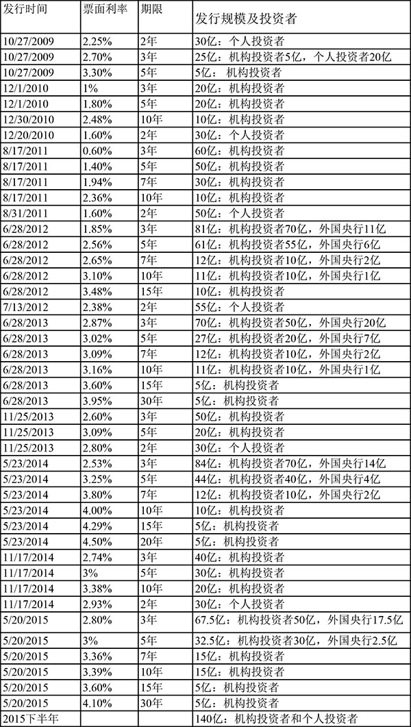 近年来,财政部开始尝试在香港发行人民币国债,并逐年稳步增加,从2009到2015年已经发行的规模分别为60亿元、80亿元,200亿元,230亿元、230亿, 280亿和140亿元,至今六年七次累计发行1220亿元,2015年还将发行140亿元,如表2所示。年期结构上主要有2年、3年、5年、7年和10年期等品种,2012年来还发行15年、20年和30年期国债,期限品种日益丰富。同时,人民币国债的发行机制逐步完善,投资对象和交易方式也不断发展,2009年,财政部按照市场惯例,采用簿记建档方式向个人和机构投资者发行人民币国债,2010年,开始尝试通过香港债务工具中央结算系统(CMU)直接面向机构投资者发行人民币国债,2012年又按照CMU招标价格向国外中央银行发行20亿元人民币国债,人民币国债在香港联交所挂牌上市交易也开始启动。2013年,首次引入香港交易所平台作为人民币国债的申购管道。
